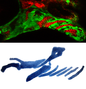 The Crump Lab is interested in how genetic information is decoded to generate the precise three-dimensional shapes of organs. As a model, the lab studies the facial cartilages and bones of the larval zebrafish, which can be continuously imaged over time in living transgenic embryos. Specific research topics include the developmental origins of the neural crest progenitor cells that build the craniofacial skeleton. As an example, the pharyngeal arches, where the neural crest cells arise (to right in green), transform into the adult facial skeleton (to the right in blue).